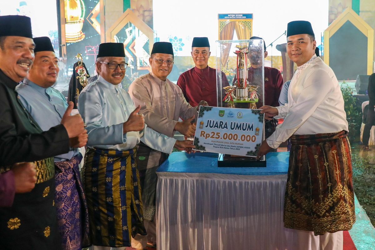Asisten Ekonomi Pembangunan Setdako Batam, Firmansyah (empat dari kiri) serahkan piala juara umum MTQH tahun 2025 pada Camat Sagulung.