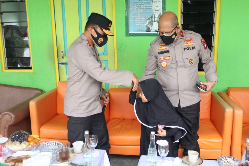 Kapolda Kepri, Aris Budiman bersama jajaran menyerahkan sembako pada pengurus pondok pesantren (atas) dan kemudian disalami salah seorang anak di pondok pesantren tersebut.