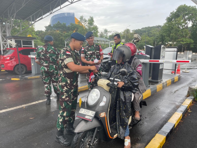 Dalam rangka menyambut Hari Ulang Tahun ke-80 Kemerdekaan Republik Indonesia, Lanud Hang Nadim bersama tim Aviation Security (Avsec) Bandara Internasional Batam menggelar aksi pembagian bendera Merah Putih kepada para pengguna jalan di pintu masuk utama bandara, Minggu (3/8/2025).