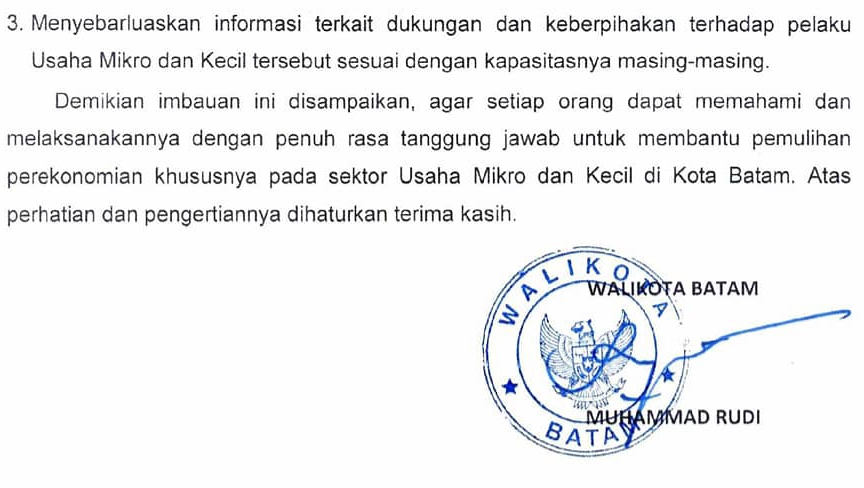 Surat imbauan Wali Kota Batam, HM Rudi, dalam rangka mendorong pemulihan ekonomi.