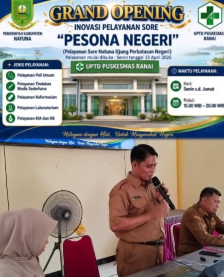 Ariranews.com, Natuna – Puskesmas Ranai resmi meluncurkan inovasi pelayanan kesehatan bertajuk “Pesona Negeri” (Pelayanan Sore Natuna Ujung Perbatasan Negeri) sebagai jawaban atas kebutuhan masyarakat akan layanan kesehatan yang lebih fleksibel.