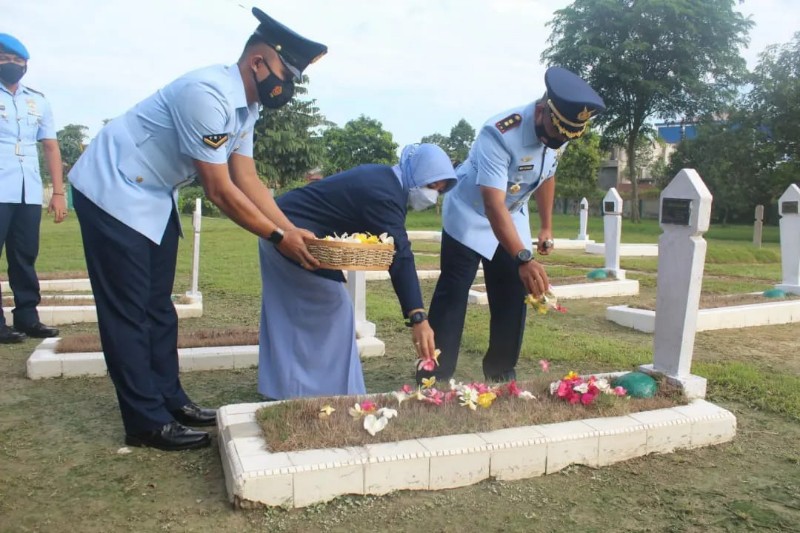 Komandan Lanud Hang Nadim, Letkol Pnb Iwan Setiawan dan istri menaburkan bunga dalam ziarah ke TMP Pusara Bhakti Bulan Gebang, Batuaji, Batam. Ziarah dilakukan jelang HUT TNI AU.