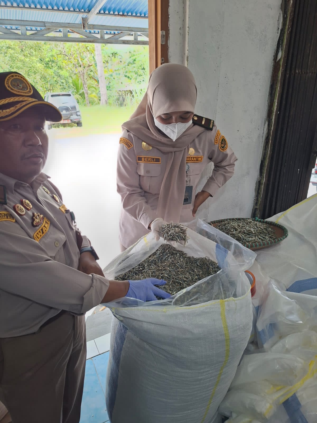 Tim Balai Karantina Hewan, Ikan, dan Tumbuhan Kepulauan Riau (Karantina Kepri) saat memeriksa ikan teri kering.