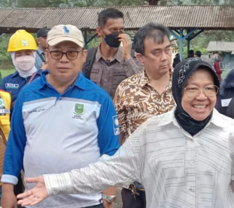 Ketua DPRD Natuna, Daeng Amhar mendampingi Menteri Sosial Tri Rismaharini saat meninjau lokasi bencana tanah longsor di Pulau Serasan, Natuna.