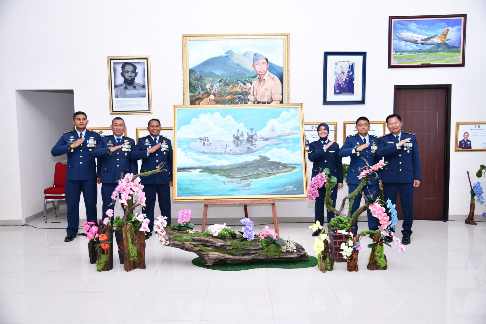 Komandan Lanud RSA, Marsekal Pertama TNI Onesmus Gede Rai Aryadi, S.E., M.M., M.Han., memperkenalkan sebuah lukisan bertema dirgantara yang menampilkan keindahan wilayah Natuna dari perspektif udara.
