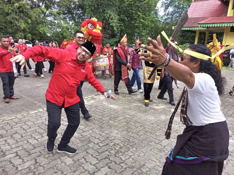 Ketua DPC PDIP Kota Batam Nuryanto ikut menari di pawai budaya dalam mengantar bacaleg ke KPU Batam.