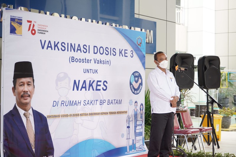 Anggota Bidang Pengusahaan BP Batam, Syahril Japarin, membuka resmi vaksinasi dosis ketiga para nakes dan penunjang RSBP Batam dengan menerapkan protokol kesehatan.