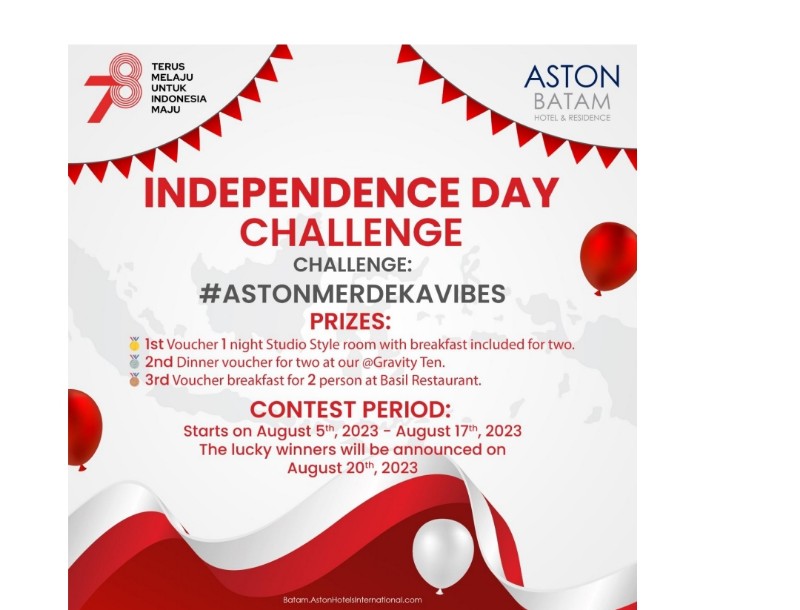 Tamu diajak menampilkan nuansa kreativitas dan patriotisme. Tamu diundang untuk berpakaian dengan tema Hari Kemerdekaan, mengabadikan momen spesial mereka di Aston Batam Hotel yang dipenuhi dengan nuansa kemerdekaan yang khas. Tidak ketinggalan, para peserta juga diminta untuk berbagi cerita tulus tentang cinta mereka pada Indonesia dan pengalaman berharga mereka di Aston Batam Hotel.