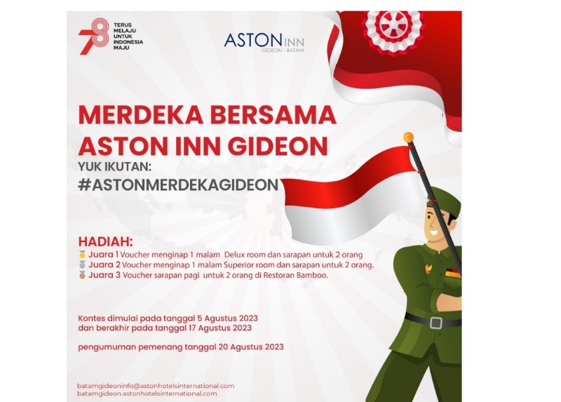Ikut memeriahkan HUT RI ke-78 Aston Inn Gideon, Batam, menggelar kontes kreativitas yang menampilkan semangat kemerdekaan, baik dalam bentuk foto, video, atau reels yang menggabungkan momen bersejarah Indonesia dengan fasilitas hotel.