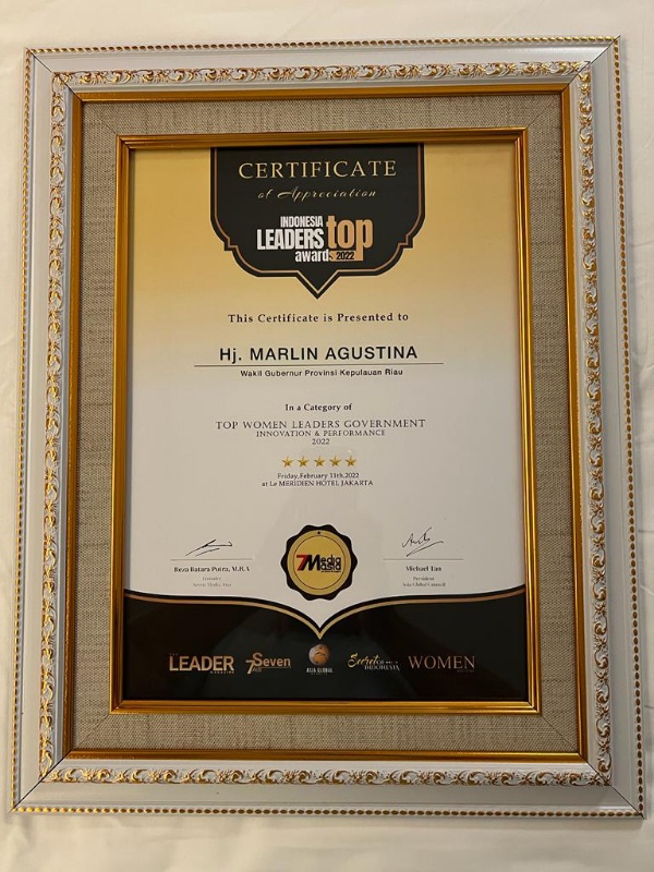 Sertifikat Top Women Leader Government Innovation & Performance tahun 2022 yang diterima Wagub Kepri, Marlin Agustina.