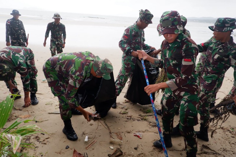 Prajurit Yon Komposit 1/Gardapati Kabupaten Natuna, Kepri membersihkan Pantai Tanjung, Kecamatan Bunguran Timur, Jumat (12/1/2024).