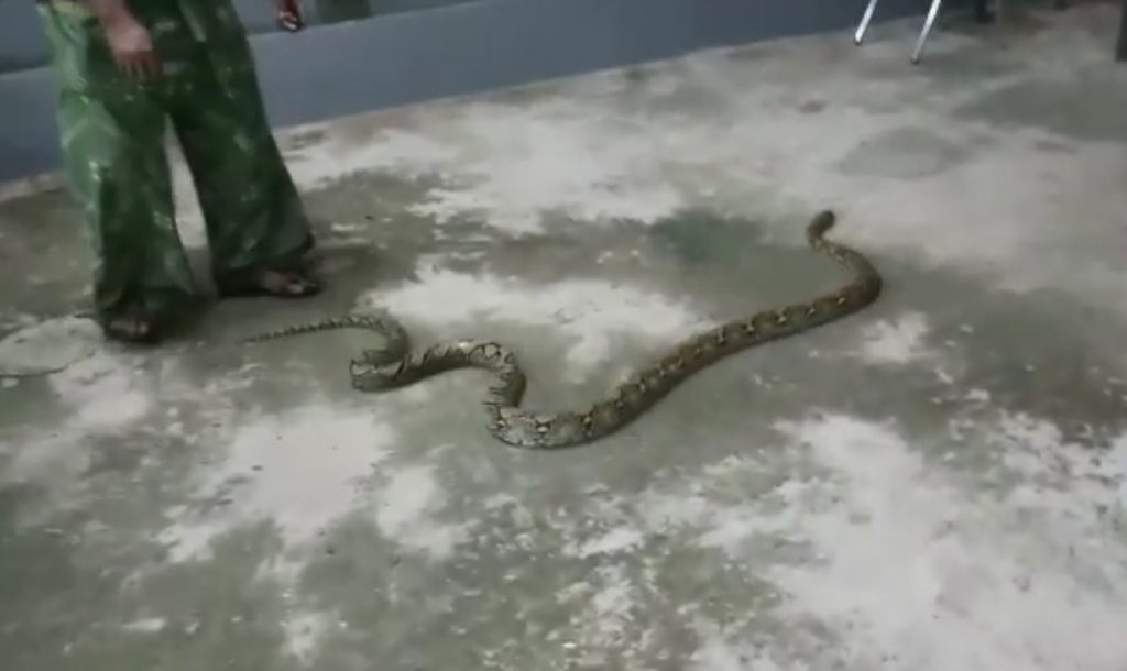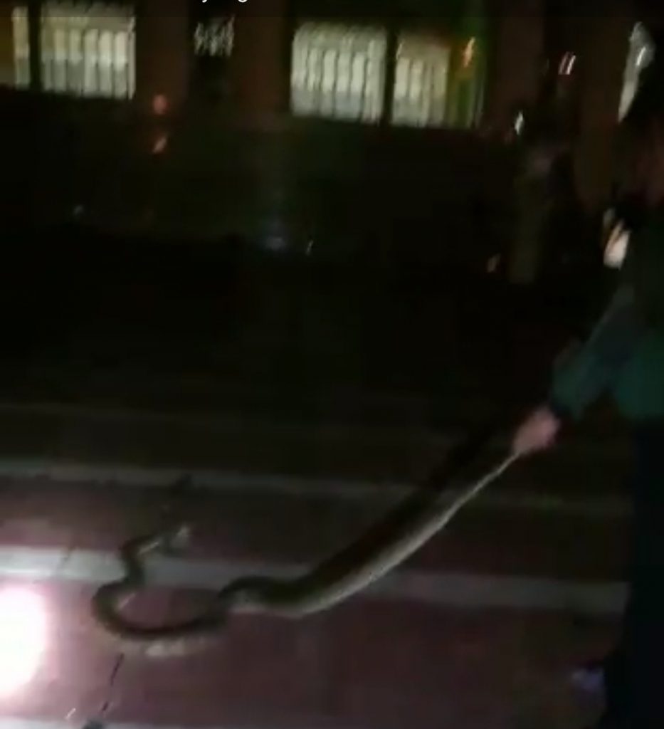“Setelah didekati dan disenter rupanya seekor ular,” ungkapnya. Kemudian dengan keahlian yang dimiliki dengan sigap petugas yang berjaga malam itu langsung menangkap ular bercorak batik tersebut.