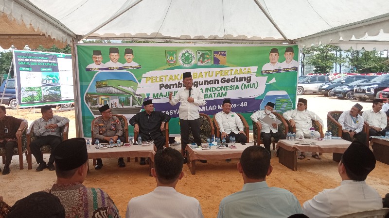 Wali Kota Batam, Muhammad Rudi berikan sambutan di peletakan batu pertama pembangunan Graha MUI Batam di Seipanas.