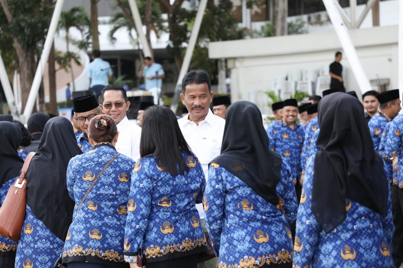 Dalam apel, Rudi dan Amsakar menyampaikan sambutan bergantian. Usai apel Rudi dan Amsakar tampak menyalami pegawai di Pemko Batam. (ara)