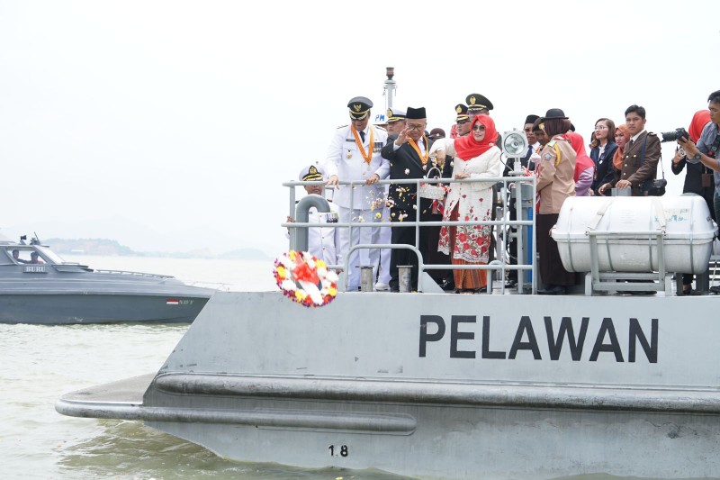 Bupati dan Wakil Bupati Karimun bersama FKPD langsung menuju Mako Lanal TBK untuk berlayar menuju perairan Selat Gelam yang berada di depan Coastal Area, untuk melaksanakan upacara tabur bunga di atas Kapal Angkatan Laut Pelawan, dengan tujuan mengenang jasa pahlawan Nasional YOS Soedarso yang gugur dalam peristiwa pertempuran laut ARU.(sus)