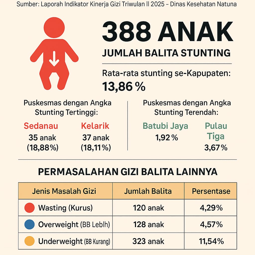 Berdasarkan Laporan Indikator Kinerja Gizi Triwulan II Tahun 2025 dari Dinas Kesehatan Natuna, hingga Mei 2025 tercatat sebanyak 388 balita mengalami stunting. Angka ini setara dengan 13,86 persen dari total balita yang dipantau di seluruh wilayah kerja puskesmas se-Kabupaten Natuna.