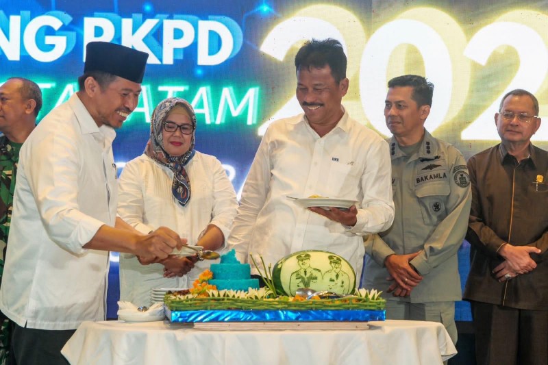 Wagub Kepri, Marlin Agustina menyaksikan pemotongan tumpeng oleh Wali Kota Batam, Muhammad Rudi dan Ketua DPRD Batam, Nuryanto saat pembukaan Musrenbang Tingkat Kota Batam Tahun 2023.