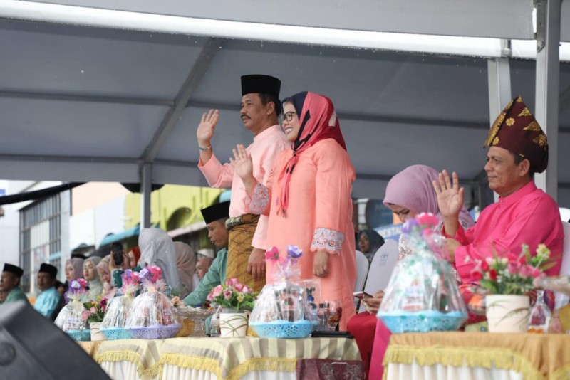 Wali Kota Batam, Muhammad Rudi dan Wakil Gubernur Kepri, Marlin Agustina melambaikan tangan pada khafilah yang melintas di depan panggung kehormatan.