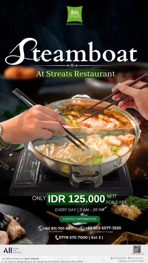 AriraNews.com, Batam – Ibis Styles Batam Nagoya menawarkan paket steamboat dengan harga ekonomis, namun dengan citra rasa yang sangat menggugah selera.