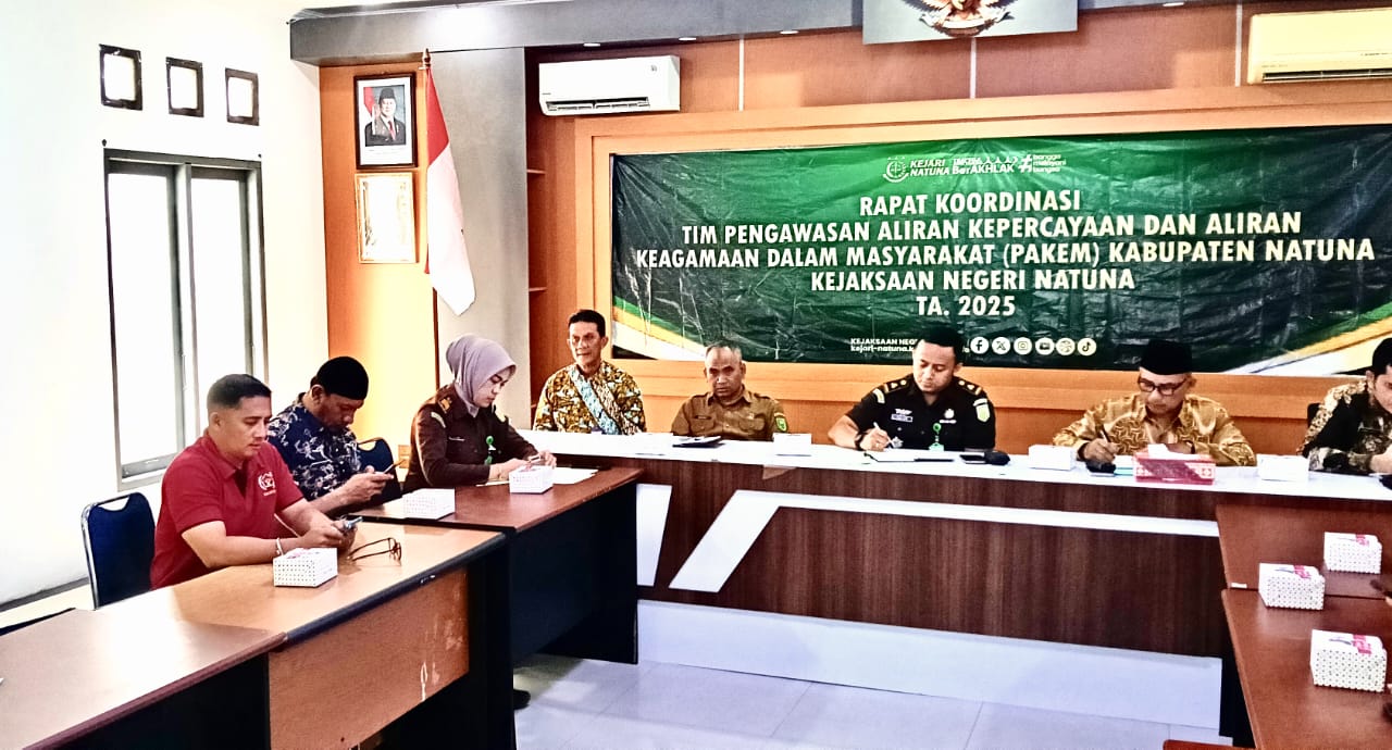 Penguatan itu dibahas dalam Rapat Koordinasi Pengawasan Aliran Kepercayaan dan Aliran Keagamaan dalam Masyarakat (Rakerpakem) ke-2 tahun 2025 yang digelar di Aula Kejari Natuna, Kamis (21/8/2025) pagi.