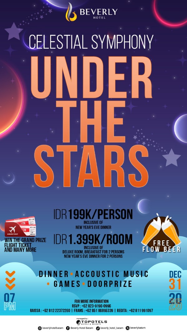 Menutup tahun 2025 dengan penuh kemeriahan, Beverly Hotel Batam menghadirkan perayaan malam pergantian tahun bertajuk “Celestial Symphony: Under The Stars”.