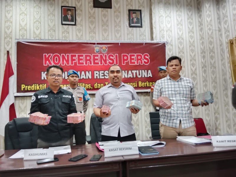 Kasat Reskrim Polres Natuna, Iptu Apridony yang didampingi Kasi Humas Polres Natuna Aipda David Arviad bersama Kanit Tipikor Darsono Purba menunjukkan uang Dana Desa yang dikembalikan saat konferensi pers di Mapolres Natuna, Jalan Air Mulung, Kecamatan Bunguran Timur, Kamis (24/8/2023).