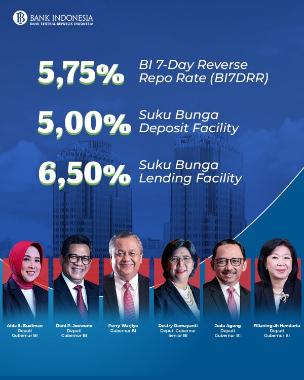AriraNews.com, Batam – Rapat Dewan Gubernur (RDG) Bank Indonesia pada 23-24 Agustus 2023 memutuskan untuk mempertahankan BI 7-Day Reverse Repo Rate (BI7DRR) sebesar 5,75%, suku bunga Deposit Facility sebesar 5,00%, dan suku bunga Lending Facility sebesar 6,50%.