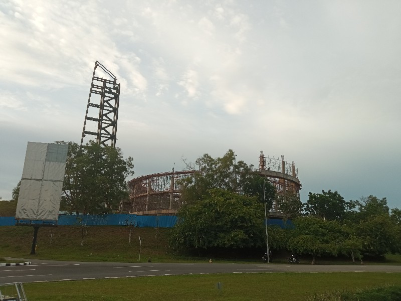 Konstruksi masjid yang berbentuk bulat tersebut sudah terlihat. Begitu juga dengan konstruksi menara setinggi 39 meter yang berada di samping masjid juga sudah terlihat berdiri. Rangka menara terlihat terbuat dari besi. Ada tangga yang terlihat dari bawah hingga ke puncak menara.