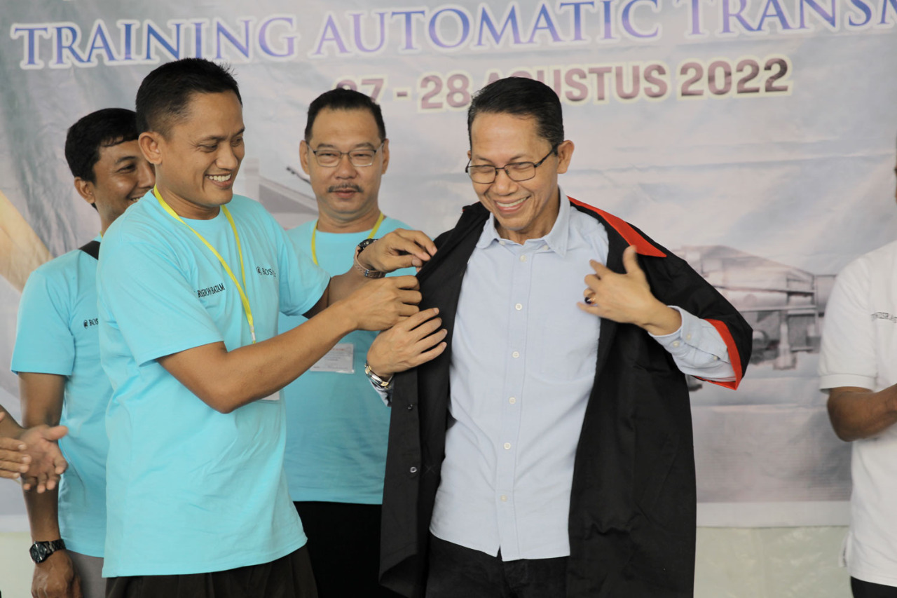 Wakil Wali Kota Batam Amsakar Achmad dipakaikan jaket usai membuka Training Conventional Automatic Transmission and Continously Variable Transmission oleh Himpunan Otomotif Batam.