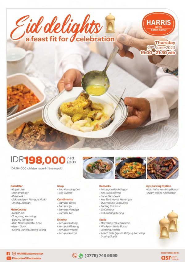 Harris Hotel Batam Center telah mempersiapkan perayaan Idul Adha ini dengan matang untuk memberikan pengalaman kuliner yang tak terlupakan bagi para tamu yang mengunjungi hotel. Paket buffet makan malam ini menjadi kesempatan yang sempurna bagi keluarga, teman, dan kolega untuk berkumpul dan menikmati hidangan spesial dalam suasana yang nyaman dan hangat.