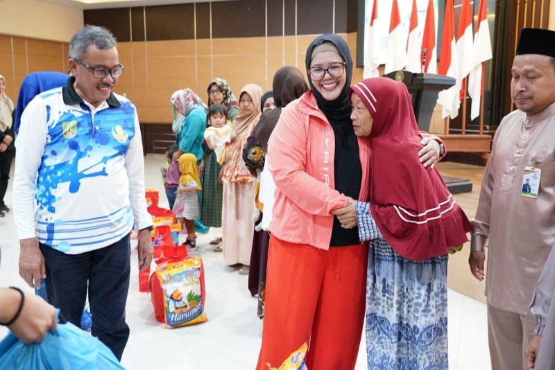 DEKAPAN KEMANUSIAAN: Wakil Gubernur Kepulauan Riau Hj Marlin Agustina, didampingi Sekretaris Daerah Kota Batam H Jefridin, dan Ketua Baznas Kota Batam Muhith, dipeluk ibu-ibu saat membagikan bantuan Baznas Kota Batam, di Kantor Wali Kota Batam, Batamcenter, Jumat (29/9/2023).