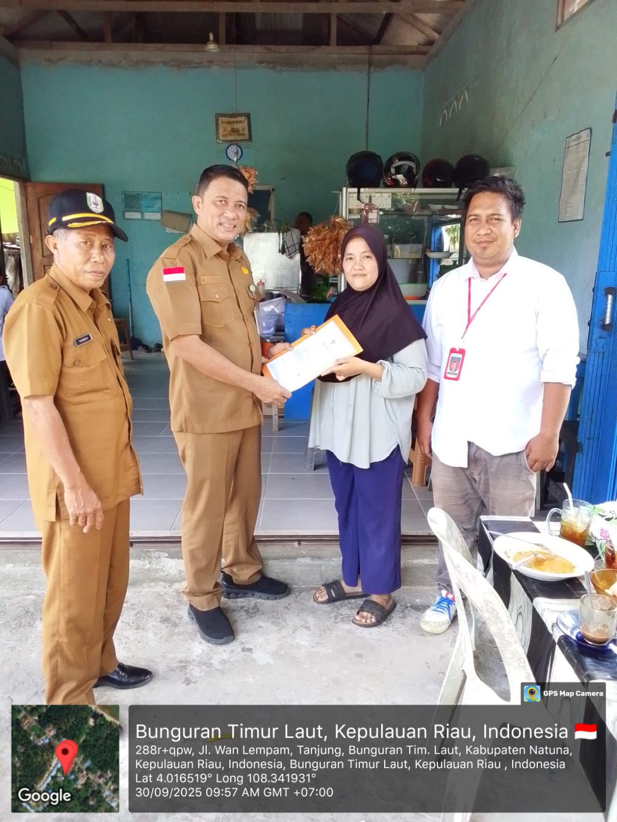Kepala DMPTSP Natuna, Ahmad Sopian, bersama Ketua LP3H Mathla’ul Anwar Natuna, Arizki Filbahri, serta Camat Bunguran Timur Laut, menyerahkan langsung NIB kepada salah satu pelaku UMKM di Desa Tanjung, Kecamatan Bunguran Timur Laut, Selasa (30/9/2025).