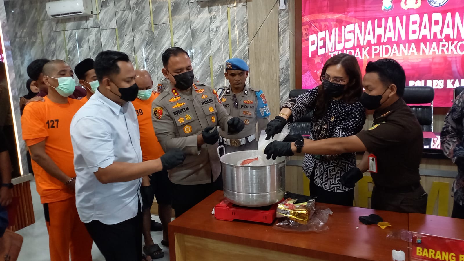 AriraNews.com, Karimun- Di depan tersangka, Kapolres Karimun, Polda Kepulauan Riau, memusnahkan barang bukti sabu seberat 2.067,52 gram hasil penangkapan terhadap dua kasus peredaran narkoba di wilayah Kabupaten Karimun, Kamis, (31/7/2025) pagi.